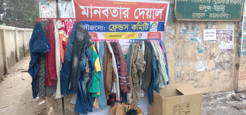 মানবতার দেয়ালে ‘আপনার অপ্রয়োজনীয় কাপড় ও জিনিসপত্র এখানে রেখে যান, আপনার প্রয়োজনীয় কাপড় ও জিনিসপত্র এখান থেকে নিয়ে যায়’। এমন লেখাযুক্ত দেয়ালে হ্যাঙ্গারে ঝুলানো রয়েছে প্যান্ট, শার্ট, গেঞ্জি, শীতের কাপড়।