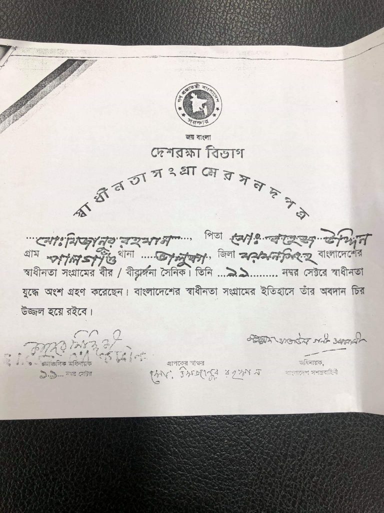 মিজানুর রহমান জানান, জেলা মুক্তিযোদ্ধা তালিকা বহিতে ৬০৫ নং ক্রমিকে আমার নাম লিপিবদ্ধ আছে। আমি ১১নং সেক্টরে বীরত্বের সহিত যুদ্ধ করেছি। আমার জেনারেল আতাউল গণি ওসমানীর স্বাক্ষরিত সদনপত্র ,ওই সনদপত্রে ১১নং সেক্টরের অধিনায়ক বঙ্গবীর কাদের সিদ্দিকীর স্বাক্ষরও আছে। যুদ্ধকালীন কোম্পানী কমান্ডারের স্বাক্ষরিত প্রত্যয়ন পত্র সহ সকল কাগজ পত্রাদী থাকার পরও এখনো আমার নামটি গেজেটে আসে নাই।তিনি আরও জানান.আমি সখিপুরের বহেড়াতৈল এলাকায় যুদ্ধের ট্রেনিং করে, বহেড়াতৈল, আছিম, লাওহাটা এলাকাসহ বিভিন্ন এলাকায় সন্মুখ যুদ্ধে অংশগ্রহণ করেছি। আমি গরীব মানুষ টাকা পয়সা নাই তাইতো আমার নাম গেজেট হচ্ছে না। আক্ষেপ নিয়ে তিনি বলেন,আমি বঙ্গবন্ধু শেখ মুজিবুর রহমানের ডাকে সাড়া দিয়ে দেশকে হানাদার পাকিস্তানিদের কবল থেকে মুক্ত করার সংগ্রামে মুক্তিযুদ্ধে অংশ নিয়েছিলাম। কিন্তু বুক ফেটে এখন কান্না আসে যখন দেখি একই সাথে যুদ্ধে অংশগ্রহণ করা সহযোদ্ধারা আজ মুক্তিযোদ্ধা হিসাবে সম্মান ও স্বীকৃতি পাচ্ছে। অথচ আমি এই সম্মান হতে বঞ্চিত। আমি মাননীয় প্রধানমন্ত্রীর কাছে আকুল আবেদন করছি জীবনদশায় আমি যেন মুক্তিযুদ্ধের স্বীকৃতি পাই। তাহলে মরার পরও শান্তি পাব।