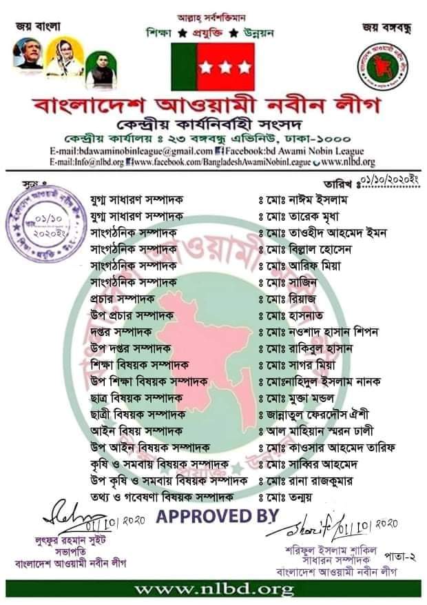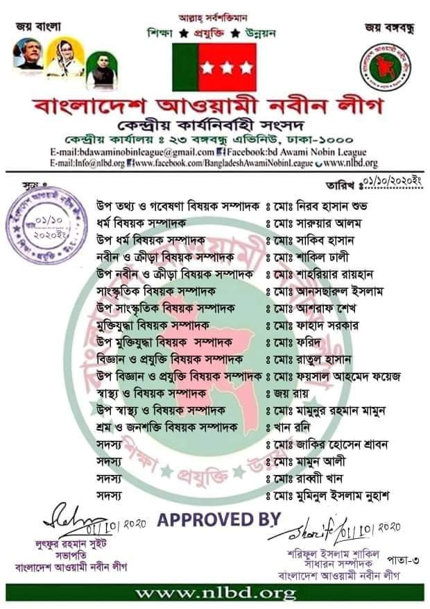 বাংলাদেশ আওয়ামী নবীন লীগের কেন্দ্রীয় কার্যনির্বাহী কমিটির সভাপতি লুৎফুর রহমান সুইট ও সাধারণ সম্পাদক শরিফুল ইসলাম সাকিল এ কমিটি অনুমোদন করেন।